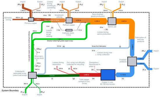 The study on copper (Cu) flows in the EU 28 [56] constituted a representation of a “classical” MFA of a highly-recyclable metal resource on a super-national level. Figure 3 shows the MFA flow chart as depicted by Soulier et al. [56].