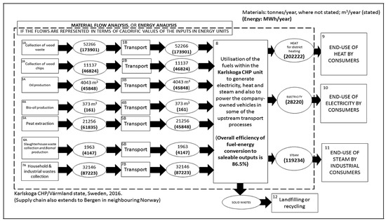 Material and energy flows of Karlskoga combined heat and power plant 2016 [57].