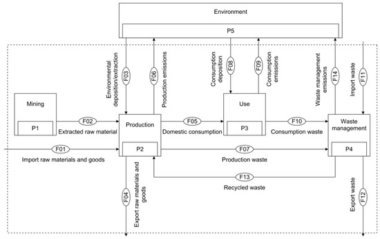 Material can enter the system either through imports (F01, F11) or deposition from the environment (F03, F08). F01 includes the import of raw material, semi-finished products, and goods ready for consumption. However, a distinction with respect to the import of waste material from outside the system (F11) is made as the latter does not enter the production process, unless it is recycled. Input to the production (F03) and use processes (F08) can, for instance, occur in the form of atmospheric deposition or freshwater abstraction. The process “environment” (P5) includes the atmosphere, biosphere, hydrosphere and pedosphere. P5 is situated outside the system boundaries because, while the magnitude of emissions to the environment from production (F06), consumption (F09), and waste management processes (F14) is an essential characteristic of a resource management system, these emissions are commonly regarded as losses or even act as pollutants in the compartment they enter. Furthermore, exchanges of air and water masses across system boundaries are usually difficult to quantify, but only play a minor role for the purpose of the analysis. Although the lithosphere can be regarded as part of the environment, geological reserves are considered separately in P1. This accounts for their importance for the management of resources.