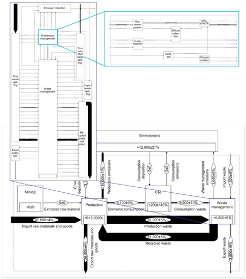 Arguably, transparency of choices could also be achieved by the meticulous documentation of all calculation and aggregation steps, for instance, as has been done by Mayer et al. [43]. However, a multilevel structure is preferable because it facilitates uncertainty assessment. STAN, the software applied in the present study, uses weighted least square minimization for data reconciliation and error propagation [68], which means that flows of the balanced system, respectively their uncertainties, are correlated [69]. Therefore, propagation of data uncertainties for manual flow aggregation is very complex, as Equation (5), where sagg. and si stand for the standard uncertainties of the aggregated, and individual flows, respectively, is only applicable to independent values of si.