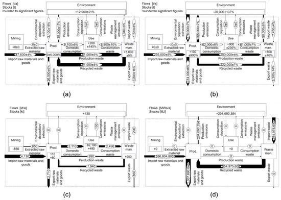 Generic MFA system of the three case studies: (a) Austrian P-N system–P; (b) Austrian P-N system–N; (c) EU28 copper system; (d) Energy flows in Karlskoga heat and power plant.