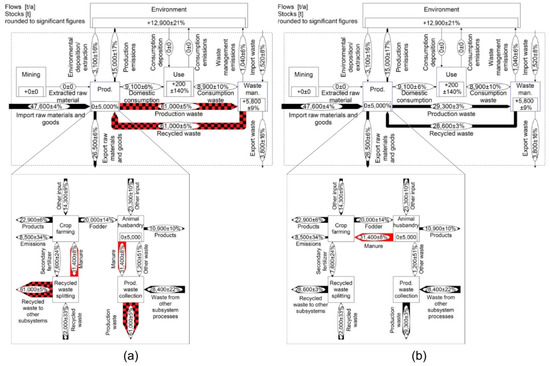Comparison of alternate forms of manure definition in the Austrian P system 2015. Generic topmost layer and schematic detail of the subsystem production if (a) manure is defined as recycled waste and (b) as a co-product. Manure flows are marked in red and checkered pattern indicates inclusion of manure.