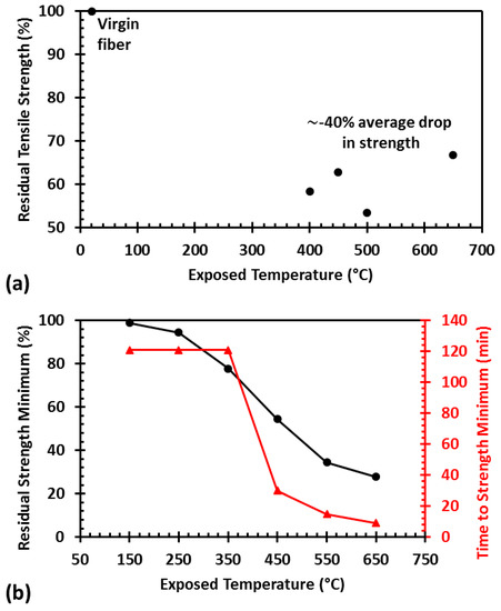 (a) Average single filament tensile strength results from pyrolyzed thermoset polyester SMC with calcium carbonate and aluminum trihydrate fillers. Redrawn from data in Cunliffe et al. Tables 8 and 9 in [7]. (b) Minimum residual tensile strengths achieved in E-glass fiber at various pyrolysis temperatures (black circles) versus measured upper bound time limit for reaching said minimum (red triangles). Redrawn from data in Feih et al. Figure 1(a) in [6].