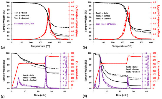 Respective TGA results for each of the tested composite waste materials. Three samples scanned at a rate of 10 °C/min for each test material: (a) SMC, (b) wind blade. Three samples during a simulated two temperature step pyrolysis procedure: (c) SMC, (d) wind blade. Data suggests a generic thermal profile capable of being used in large scale pyrolysis recycling [14].