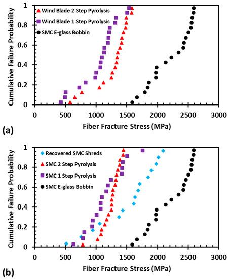 Fibers collected from the single and two-step pyrolysis processes were characterized via single filament tension testing. Sample fibers were tested without any surface char removal procedure in order to isolate the effect of the different pyrolysis procedures. Figure 3 indicates that the two temperature step pyrolysis process yielded a 19% improvement in final Weibull characteristic tensile strength of the wind turbine blade glass fibers and an around 5% improvement in the SMC recovered fibers. This suggests that merely adjusting temperature, without using any additional post processing steps, does have the potential to process glass fiber composite recyclates with higher output mechanical strength. Of interest though is why there appears to be such a large difference in the effect between the wind blade and SMC recovered fibers. This can be understood by closer examination of the Weibull tensile strength plots in Figure 4. While these plots show the expected leftward shift to lower fiber fracture stresses from virgin to pyrolyzed material, Figure 4b also shows single filament tensile strength measurements of glass fibers recovered from the shredded SMC, before pyrolysis recovery, which exhibit reduced strength values as well. This indicates that the glass fibers in the SMC material had already been damaged with a −27% difference in strength before any recycling attempts were made. The two temperature step pyrolysis can therefore only be responsible for the remaining −17% of the total −44% difference in final tensile strength from virgin E-glass. As pyrolysis cannot recover fiber strength that the input material did not possess, these results suggest that pre-existing fiber damage may be more of a limiting factor in the recycling of glass fiber composites than damage introduced during fiber reclamation. This damage may also help explain the trend in Weibull modulus, a non-dimensional measure of the projected spread in fiber tensile strengths within a specimen with larger values indicating a narrower distribution. Table 1 shows that the virgin E-glass bobbin specimens start with the narrowest distribution in tensile strength; however, as some of the fibers are damaged at random through part production, in-service use, and shredding, the distribution in fiber strengths widens. As all the fibers become damaged by the pyrolysis heat treatment though, the distribution in stronger and weaker filaments begins to shrink.