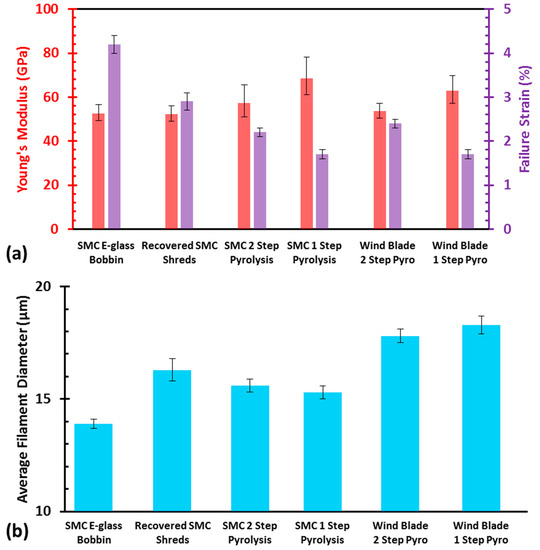 The observed changes in Young’s modulus likely stem from the thermal compaction and densification of E-glass fibers that is known to occur at elevated temperature ranges [16,17]. Examining average filament diameters in Figure 5b, there does not appear to be a significant difference between the fiber diameters from the 1 and 2 step pyrolysis procedures for either sample material; however, comparison of SMC pre-pyrolysis shreds against pyrolyzed fibers does suggest a small contraction in fiber diameter. Interestingly, there also appears to be a clear difference in fiber diameter from the original virgin material and both the pre- and post-pyrolysis fibers. This suggests that further glass fiber structural changes may be occurring earlier in original composite production.