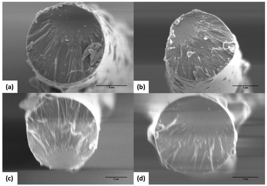 SEM images of example fracture surfaces observed from recovered pyrolyzed filaments: (a,b) SMC samples; (c,d) wind blade samples. Images captured with a Hitachi S-3400N SEM.