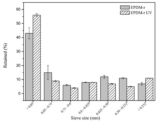 It was found that the particle size distribution generally did not present significant differences. The largest proportion of granular solids was found in the range of 20–25 mesh (0.85–0.71 mm) for both samples. However, a higher concentration of EPDM-r UV was retained in the 20-mesh sieve (particle size > 0.85 mm).