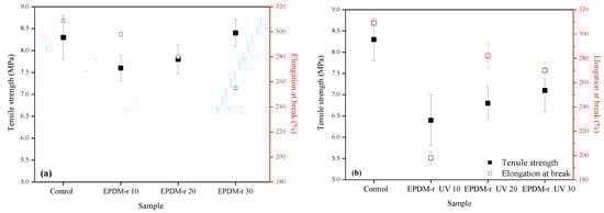 Tensile strength and elongation at break results of the blends: (a) EPDM-r and (b) EPDM-r UV.