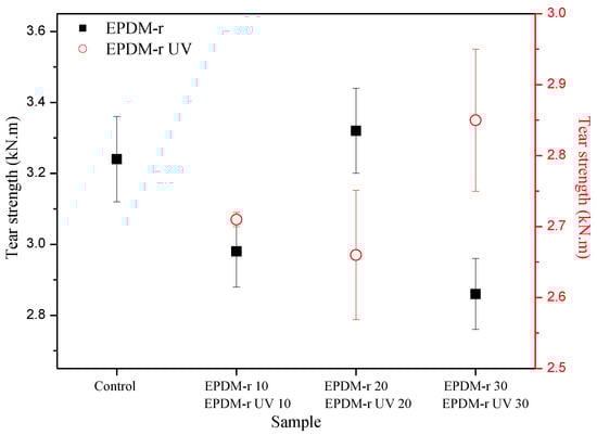 In general, the results of the tear strength of all the samples were inferior to the value of the Control sample, with the exception of the EPDM-r 20 sample. These results corroborated the previously discussed MH (Table 4) and density (Table 5) results. The tear strengths of the EPDM-r UV samples were lower than those of the EPDM-r samples. According to Coran et al. [38], the tear strength property is higher for smaller cross-link density, and the de-vulcanization which took place during the aging process favored the later vulcanization of the blends by promoting an increase of the cross-link density. The influence of the ∆M on the tensile strength and elongation at break behavior of the EPDM-r and EPDM-r UV blends is shown in Figure 4. The curves represent the trends observed during the analysis of the results.
