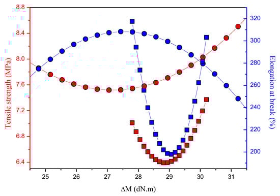 Influence of the ∆M on the tensile strength and elongation at break behavior of the blends. The circles are the EPDM-r samples and the squares are the EPDM-r UV samples.