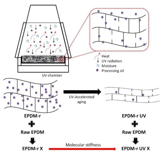 Schema showing the UV-accelerated aging process of the EPDM residue and its influence on the properties of the EPDM-r UV blends.