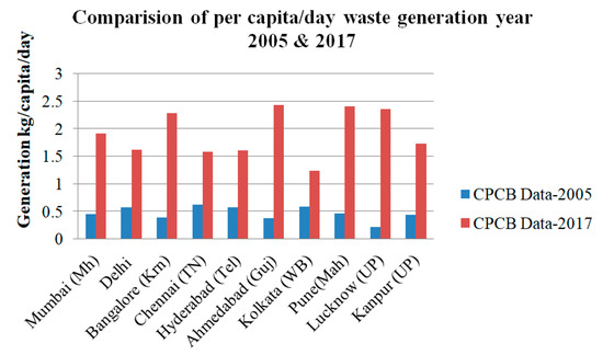 Per capita solid waste (SW) generation rates of various Indian cities (Source: CPCB-2004, CPCB, 2017).