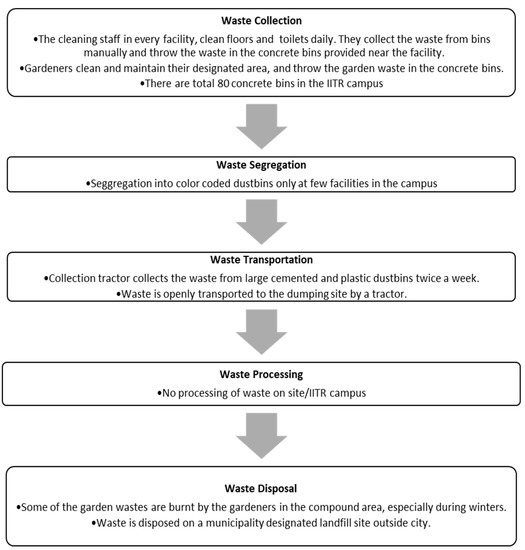 The case study was analyzed during the immersive experience of the authors on the campus during the research. For this study, primary surveys were conducted by the authors at the IITR campus over a period of two months starting from November 2018 to December 2018. During the field study, the data was collected by the authors through (a) personal observations (b) interviews with professors, students and employees, and (c) in the form of recorded documents from the campus authorities. The survey inquired about the various details of SWM at the campus. For the purpose of the study, the IITR campus was divided into nine zones and a survey of each zone was conducted to identify (i) the types of waste, (ii) quantities of waste, (iii) management practices and (iv) issues and challenges. Samples were collected from various bins qualitative (visual) and quantitative data was collected. Discussions with the mess in charge, cleaning staff and management staff were held and issues were identified. Table 3 shows a typical example of the data collection. All the data collected in the primary survey was filtered, analyzed and documented. The data was analyzed based on literature study and using Microsoft Excel as a tool. Further, all information pertaining to each step of SWM on the campus was gathered and the quantity of waste was obtained. Data was compiled and tabulated as per the type of waste generated on campus and the quantity of each type of waste. Then the data collected from these sources was diligently analyzed and tallied against each other to identify the issues of SWM in IITR campus along with the issues cited by the interviewees. An optimum solution for each issue was provided based on the Section 2, Theoretical Background. Figure 5 details out the steps of SWM at the IITR campus based on the survey.