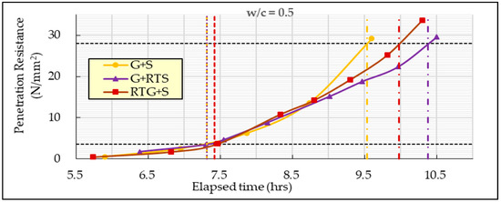 As per setting time, the results show longest elapsed time from initial to final setting of concrete containing fine recycled roof tile, as shown in Figure 7. Apparently, there is little difference in initial setting time but a marginal difference in the final setting time, especially between the control mix and RTG+S. Nonetheless, a big margin was observed in the final setting time, especially between the control mix and G+RTS concrete.