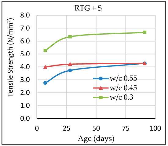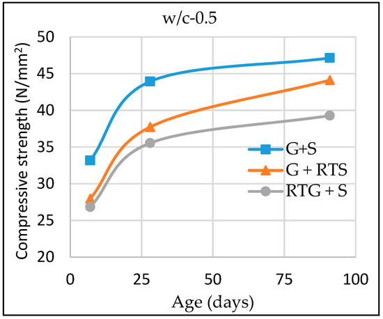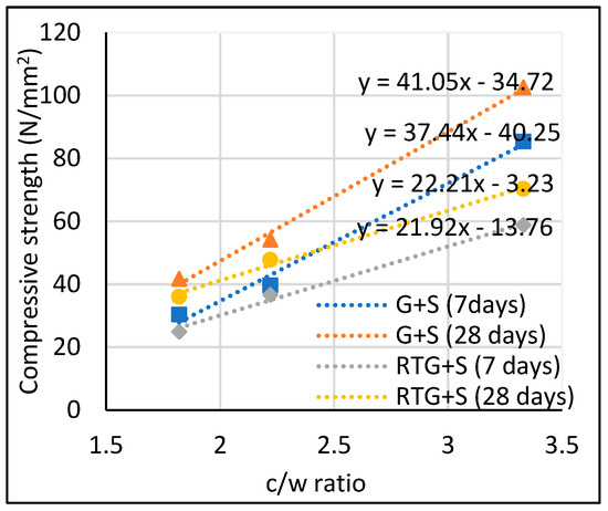 Figure 8 shows the relationship between compressive strength of concrete samples with cement-water ration (c/w) whereas Figure 9 shows strength development of the different concretes with age. Fitting lines and their corresponding equations at 7 & 28 days compressive strength are generated for the determination of water cement ratio (w/c) of RTG+S concrete and control mix at the same compressive strength. According to generated equations for 28 days compressive strength, for 40 N/mm2 and 80 N/mm2, w/c of RTG+S concrete decreased by 4% and 9%, respectively, compared to normal concrete. This implies that cement content would increase if recycled roof tile aggregate is used for high strength concrete as compared to normal aggregate concrete. As for normal strength concrete, difference in w/c is small and this meant that the disadvantage is minor.