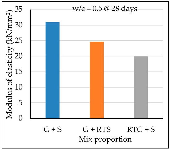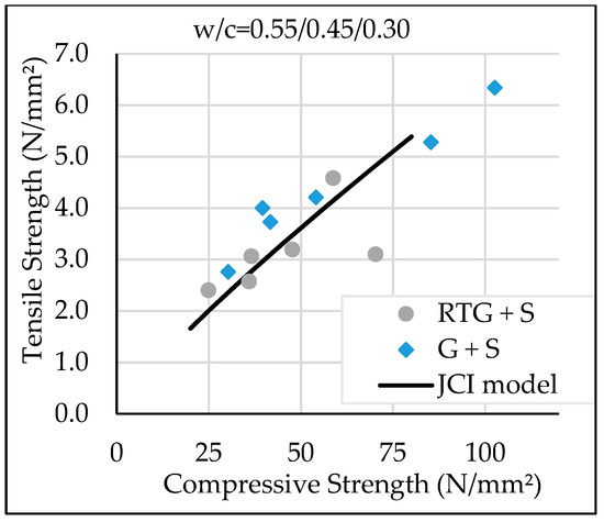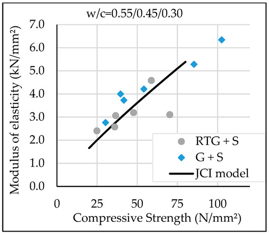 Test data indicate lower modulus of elasticity of concrete containing recycled roof tile aggregate than the normal aggregate concrete mix. Studies by Bui et al. [6] indicates that the partial replacement of normal coarse aggregate by recycled roof tile aggregate at a 40% replacement ratio by volume decreases modulus of elasticity of concrete by 4.9–12.8%. This trend was also reported in a published paper by Tobita et al. [7], which demonstrated that modulus of elasticity of clay roof tile aggregate concrete was significantly lower than that of normal aggregate concrete. Predicted relationships with compressive strength of modulus of elasticity Ec (t) and splitting tensile strength fc’(t) were obtained using the JCI 2016 guidelines, as previously described in Section 3.3.1. The graphs show that JCI model Equation (1) can be used to predict the splitting tensile strength of concrete RTG+S but Equation (2) is not suitable for prediction of modulus of elasticity of the same concrete type. As a result, the authors have proposed use of “0.6” of JCI model equation to predict modulus of elasticity for concrete containing coarse recycled roof tile. This reduction coefficient, “0.6” is about the same as that for modulus of elasticity of light-weight aggregate concrete proposed by Japanese specification for structural design of concrete structures [22].
