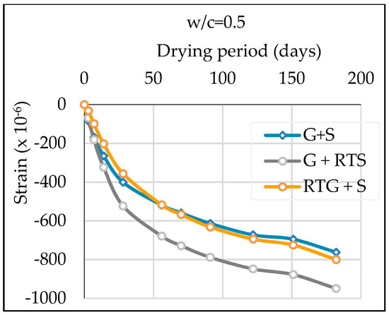 Figure 14 illustrates that G+RTS concrete showed fastest and highest shrinkage, whereas RTG+S concrete demonstrated the slowest shrinkage during first two months. Maximum shrinkage for mix containing fine recycled roof tile exceeded the limit value of 800 × 10−6 micro-strain during the six month period.
