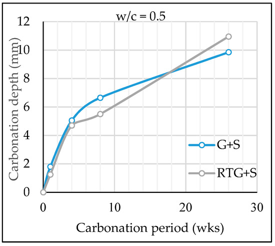 The permeability of concrete is associated with the pore structure of paste matrix and aggregate, which means that the rate of ingress of substances such as sodium, chloride, carbon dioxide, etc., into concrete is highly dependent on the pore structure of the concrete. Concrete RTG+S showed similar or better performance against chloride ingress and carbonation as compared to G+S concrete, which implies that such concrete could be a good option in carbonated or chloride aggressive environments such as coastal and marine structures. These experimental results showed that high porosity of recycled roof tile aggregate does not cause high rates of ingress of substances. It was reported in published papers that the use of roof tile aggregate improved resistance to carbonation and chloride ion penetration of concrete. It was also reported by Muragishi et al. [23] that the moisture in roof tile aggregate particles might have the effect of internal curing, which densify the microstructure of cement hydration. It can be seen that the experimental results of carbonation and chloride ion penetration shown in this study also support the idea of internal curing by roof tile aggregate.
