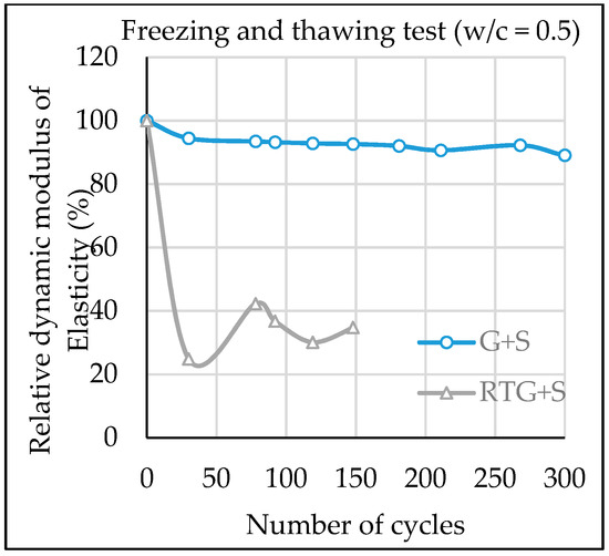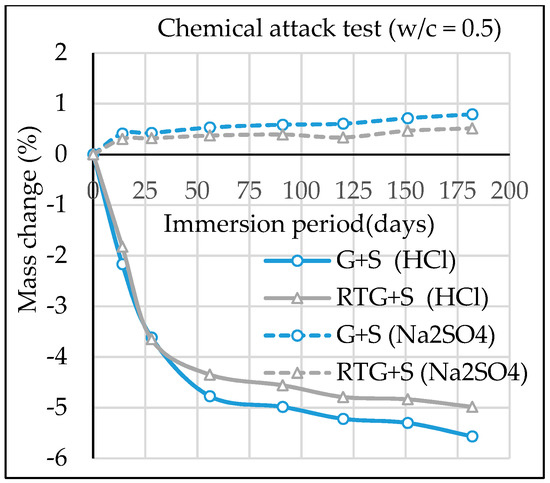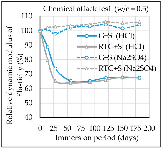 By visual observation of samples during the study, deterioration of specimens was more when exposured to the hydrochloric acid (HCl) solution than sodium sulfate (Na2SO4) solution. Research has it that by visual verification of samples after 6 months, deterioration of the specimen was more when exposured to the acidic solution than sulfate solution [24]. For freezing and thawing resistance, test results of dynamic modulus of elasticity showed a drastic change for concrete RTG+S and subsequent failure just after 150 cycles. The overall data indicate that recycled roof tile aggregate concrete has poor durability against freezing and thawing. These findings agree with experimental results in a published paper by Kasai et al. [25], in which pour frost resistance was observed in concrete with clay roof tile coarse aggregate with absorption of 7.86%. Henceforth, it is suggested that recycled roof tile aggregate is not suitable for concrete structures in severe freeze-thaw exposure conditions. Overall, the obtained data showed the interesting durability performance of recycled roof tile aggregate in concrete, but the additional study will be helpful to counter check the findings of this study.