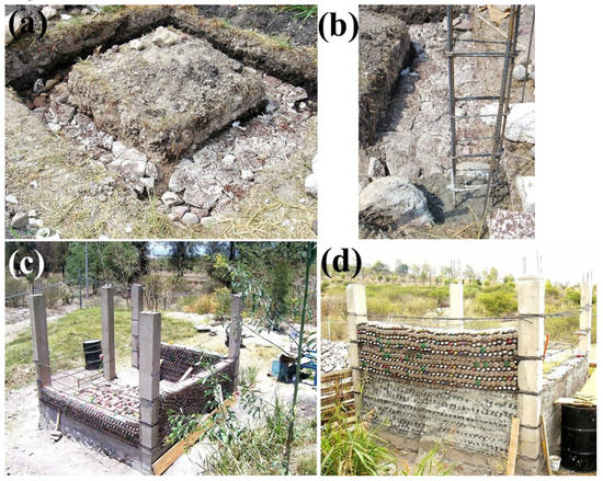 Figure 4 shows the images of the building process for the housing prototype in which PET bottles were used for both the walls and the roof. There were also other waste materials employed in the construction. The foundations used concrete pieces obtained from the demolition of a building. The bottles were filled with sand obtained from the excavation of the foundations, but the façade wall was installed using empty PET bottles without screw caps. This was to avoid deformations by temperature changes during the year, which occurred in stacked PET bottles. The result was a greatly simplified work, because the filling of the bottles was difficult. There was no significant difference between the façade and the other three walls in terms of stability, humidity accumulation or temperature transference.