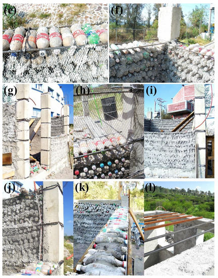 (a–s) Images of the building process for the housing prototype using PET bottles.