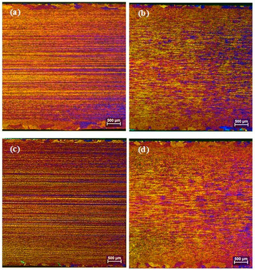 Figure 6 shows the optical micrographs for sections prepared metallographically from the BA-6111 extruded planks. The microstructure of the extruded planks showed an un-recrystallized fibrous structure core with some peripheral coarse grain (PCG) especially for the MC-DC sample as shown in Figure 6c,d.