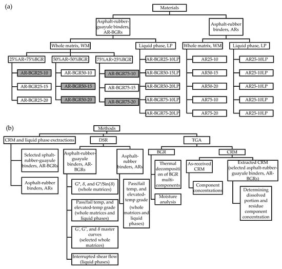 Flowcharts of experimental plan: (a) Materials and (b) methods. The five selected asphalt–rubber–guayule binders for the study completion are highlighted in (a).