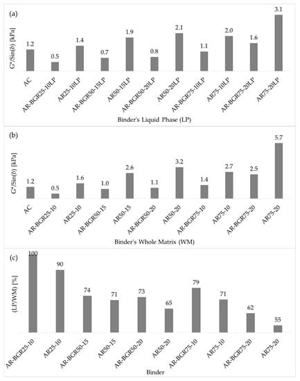 For more clarification, Figure 2c depicts the percentage of liquid phase per the whole matrix (LP/WM%) as a function of G*/Sin(δ). It was noticed that the effect of removing the residual CRM particles from the binder matrix was relatively better for the asphalt–rubber–guayule binder compared to the asphalt–rubber binder as was also verified by LP%, as shown in Table 4.