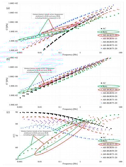 As is shown in Figure 3c, the B(4) and AR-BGR25-10 presented unconventional δ trends, which were unlike what the original asphalt presented. In other words, the original asphalt provided a δ trend formed higher to lower from low frequencies to high frequencies, respectively, which was contrary to the provided δ trend of the higher guayule resin-including binders. Accordingly, the other asphalt–rubber–guayule binders showed a thermo-complexity via their δ trends. For instance, the δ trend of AR-BGR75-20 started low at 0.001 Hz, reaching its peak at about 0.01 Hz, gradually going down until 10 Hz, and ending up with a horizontal trend. This fluctuation could be analyzed by the influence of the contrary trends of asphalt against guayule resin in terms of the δ. Other asphalt–rubber–guayule binders such as AR-BGR50-15 and AR-BGR50-20 presented significantly scattered regimes. Nevertheless, their average trends showed the lowest sensitivity to temperature and frequency than original asphalt. This could be analyzed by balancing the concentrations of asphalt–rubber and guayule resin in the blend.