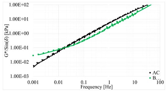 At lower frequencies, the master curves of guayule resin offered an unconventional behavior. Guayule resin presented the best behavior compared to all others at low frequencies for all three major rheological parameters—G’, G”, and δ (Figure 3). That is why it showed better performance (G*/Sin(δ)) than that of the original asphalt at low frequencies, as shown in Figure 4. For G’ trends, the guayule resin presented a behavior much better than the original asphalt, while the frequency was lower than 0.3 Hz (e.g., 0.01 and 0.00001 kPa, respectively, at 0.001 Hz). For G” trends, a similar scenario was observed in which the guayule resin presented better behavior than asphalt while the frequency was lower than 0.01 Hz (e.g., 0.011 and 0.002 kPa, respectively, at 0.001 Hz). As mentioned above, the guayule resin presented an unconventional δ trend that was contrary to the original asphalt (Figure 3c). In terms of frequency sweep, this trend is desirable as it yields a higher elastic behavior at low frequencies, unlike the traditional behavior attributed to the original asphalt. Consecutively, the guayule resin presented desirable characteristics at low frequencies since it presented higher G’ and G”, as well as lower δ. This distinction could be beneficial when vehicles stop since the pavement is desired to be stiffer (to resist the loads at low frequencies) and more elastic (to recover when deformed).