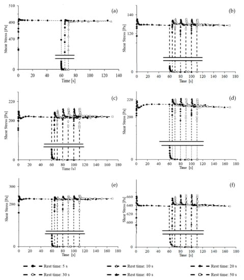 Figure 5a–f shows the stress growth upon the interrupted shear flow of: (a) The original asphalt, (b) AR-BGR25-10LP, (c) AR-BGR50-15LP, (d) AR-BGR50-20LP, (e) AR-BGR75-10LP, and (f) AR-BGR75-20LP (T = 64 °C, rest times of 5, 10, 20, 30, 40, and 50 s, as well as a shear rate of 2 s−1).