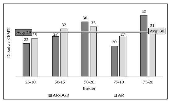 The CRM was released from the binder liquid phase, as mentioned above. Consecutively, the dissolved CRM was calculated for the binder whole matrix. As can be seen in Figure 10, the higher CRM dissolution resulted in a higher CRM concentration such as 40.5% and 36.2% for AR-BGR75-20 and AR-BGR50-20, respectively. Nevertheless, this went lower with lower CRM concentration, such as in the case of AR-BGR50-15 and AR-BGR75-10 that resulted in a dissolved CRM percentage of 26.6% and 20.3%, respectively. Furthermore, AR-BGR25-10 yielded 21.8% dissolved CRM. As the CRM dissolution analysis indicated a maximum of about 40% of dissolved CRM that could not justify the close pass/fail temperatures of the liquid phase vs. the whole matrix, as shown in Table 4.