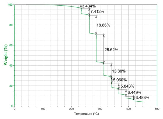 Thermo-gravimetric analysis (TGA) chart of 4 h heat-treated guayule resin (B(4)), stepwise isothermal thermo-gravimetric (SITG) method—from ambient temperature to 450 °C.