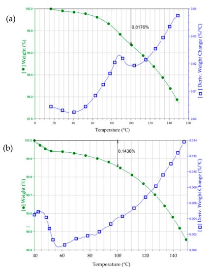 Moisture investigation of guayule resin by TGA: (a) As-received material, and (b) after 4 h heat treatment at 160 °C, and 600 rpm.
