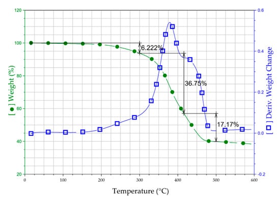 For a CRM, an amount of 20–25 mg was analyzed with a 20 °C/min heating rate starting from the ambient temperature and reaching 600 °C. According to literature, a CRM has four major components: Oily components, natural rubber, synthetic rubber, and filler components such as carbon black. Each component has its range of decomposition temperatures. The first region corresponds to the oily components and is from 25 to 300 °C, the second region corresponds to natural rubber and is from 300 °C to the temperature corresponding to the minimum point between the two peaks in the derivative thermo-gravimetric (DTG) curve, and the last region is the filler components at 500 °C [15,22].