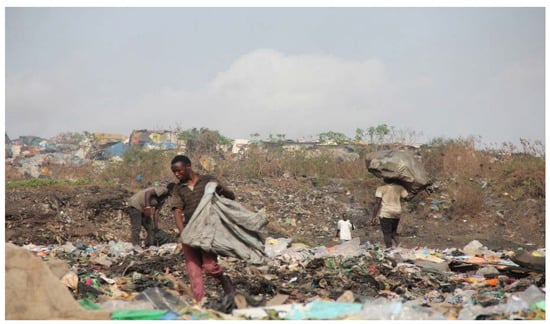 The problem of waste management in Nigeria can also be accredited to the lack of public policy enabling legislation and an environmentally stimulated and enlightened public [7]. Even though laws and regulations were formulated and presented in the past, there has not been any functional infrastructure for their implementation. A case-in-point was the establishment of the Federal Environmental Protection Agency (FEPA) in 1981. The outcome of this act brought about resurgence of many states within the federation establishing their own waste management authorities for the safety and development of the environment. However, the regulations set for operations were unsuccessful because of the absence of effective sanctions, coupled with economic considerations that are deficit of knowledge of interdependent linkages among various processes involved in both human and environmental resources to mitigate the myriad of waste management challenges [11,12,13]. Suitable policy and organised mechanisms for execution are vital for sustaining a sound waste management system. Where the policy is weak, or there is no legitimate implementation of laws and controls or the general society is not appropriately enlightened, waste management becomes a critical challenge. Given the circumstances depicted above in numerous urban territories, diverse Nigerian urban areas have been portrayed as filthy and unsanitary [14]. It is, therefore, apparent that solid waste management remains a significant issue that requires urgent attention in Nigeria.