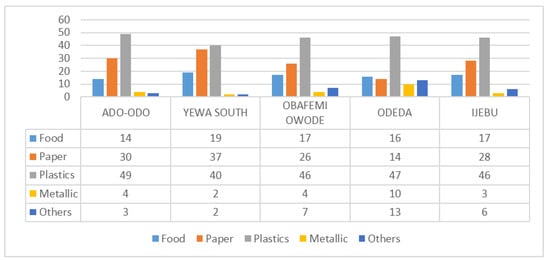 The results show that across all five local government areas, plastics make up a majority (45.6%) of the type of solid waste generated by the respondents, followed by paper (27%), then 16.6% food wastes (Figure 4, Table 8). These statistics possibly rely majorly on the income level of the respondents, as it is cheaper to purchase plastics and paper materials. The occupation of the respondents could also affect the solid waste generated [23]; for instance, school students and civil servants handling a lot of paperwork would most likely create higher volumes of paper waste than those working in stores or kitchens.