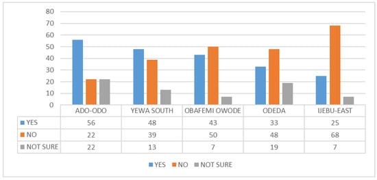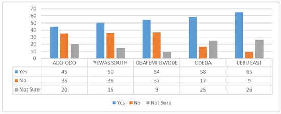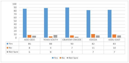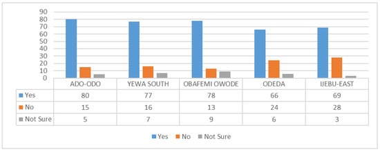 This question looked into the desire of the respondents to participate in any improvement initiative concerning solid waste management, which could be presented to them. There was an 85.8% positive response across all five local governments on this question (Figure 6). Majority of the respondents were willing to contribute to the betterment of their environment in any way possible, regardless of their age, gender, occupation, educational or income levels, as a healthy, safe, and sanitary environment is an ideal condition desired by anyone in any given society [20].