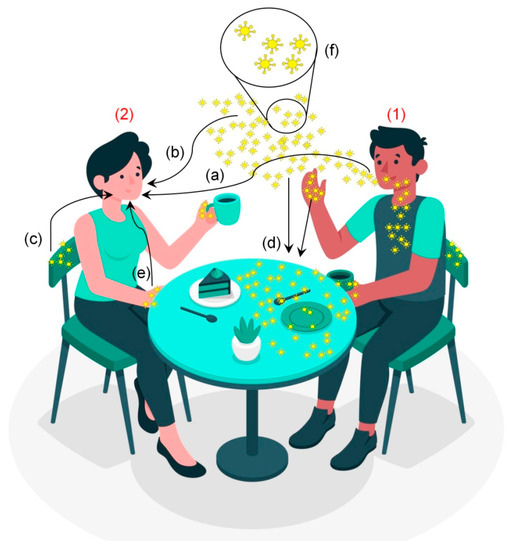 Schema showing the main ways of COVID-19 contamination, in which the person (1) is infected (even being asymptomatic), and person (2) is not yet infected (susceptible individual): (a) Person-to-person and (b) via airborne or aerosol, which are direct ways of transmission. (c) Via fomite, an indirect way of transmission. (d) Contaminated objects, such as the table, are the result of the droplets fall containing active virus present in the airborne/aerosol and/or by the contact of the infected person. (e) By touching a contaminated object and touching the eyes, mouth, or nose, a healthy person can get infected. (f) Magnification of the active virus, present in the droplets excreted from the mouth and nose when the infected person sneezes, coughs, speaks, and breathes. Modified from [18].