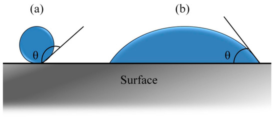 The droplets consist mainly of mucus, saliva, and active virus [23]. They have different sizes and compositions (which directly influence their viscosity), forming a kind of protective cover on the virus. So, it is believed that the greater the intimate contact between them (Figure 2b), the greater the droplet tendency to remain on the surface. In other words, the higher the θ value (Figure 2a), the higher the probability/facility of the droplet to be removed from a given surface by the action of a sanitizer, for instance.