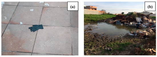 Waste disposed of in inappropriate places can also contaminate the soil and groundwater due to slurry produced from the decomposition and percolation of water through waste (such as in Figure 3b), in addition to the risk of fire, both by self-combustion (spontaneous ignition) and by intentional/criminal ignition. Slurry usually contains toxic metals and other harmful waste stemming from improper disposal of materials such as solvents, paints, cleaning products in general, and oils, among many others [70]. The waste pile begins with the inadequate disposal of any waste, such as a glove (Figure 3a) or a mask that was used to save lives. Besides, it can assist in urban waterproofing, aggravating the problem of floods in cities through the clogging of manholes caused by the accumulation of waste carried by rainwater or winds (Figure 3). Furthermore, clogged manholes and waste disposed of in inappropriate places (Figure 3b) can become ideal environments for the reproduction of disease-transmitting insects, such as Aedes aegypti mosquito, the vector of diseases such as dengue, chikungunya, yellow fever, and zika [71].