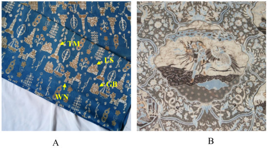 The most popular motifs of the Zie Batik products by themes. The iconic landmark of Semarang City or more popular with Semarangan motifs (A) and the legend of the Javanese Puppet stories (B). In the Semarangan motifs, the natural dye batik is fully decorated with the iconic buildings of Semarang City, such as Tugu Muda (TM), Lawang Sewu (LS), and Gereja Blendug (GB), as well as the city mascot Warak Ngendok (WN), a well-known mythological animal in Semarang City.