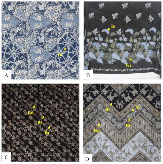 Various natural batik of the Zie Batik products by organic material-based natural dyes: (A) batik mina (fish motif), one natural dye; (B) caladium leaves and butterfly motifs, three natural dyes; (C) parang mangrove motif, three natural dyes; and (D) Warak Ngendhog motif, four natural dyes. In each batik, the main colors were indigo (In), green (Gr), red (Rd), black (Bl), and brown (Br).