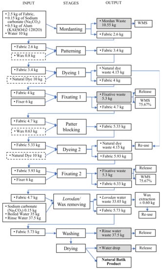 The data was collected by directly observing the dye- and batik-producing process and waste management in Zie Batik’s working space. Furthermore, to confirm the data used in this investigation, in-depth interviews were held with 15 respondents—dye plant farmers; 3 respondents—the Zie Batik owners; 5 respondents—the Zie Batik workers; and 15 interim students at Zie Batik. This information was then arranged through a matching process to get the completeness and reliability. The reliable information was however reshaped to match an analyzable data format and was then reduced to eliminate unnecessary data. In addition, the final information was transformed into data and analyzed through categorizing, labeling, and annotating. The final result was interpreted with a narrative analysis technique. Meanwhile, the data obtained include the raw materials used, mass balance of the batik production process, the produced waste, the obstacles encountered, and the good housekeeping methods applied.
