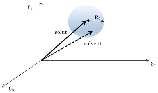 where Ra is the vector for the solubility parameters of the solvent and solute. Furthermore, the solute has a specific interaction radius, R0. If the tip of the vector for the solvent HSP exists inside the sphere with a radius R0, wherein the center is the tip of the solute HSP vector, the solute can be determined to be soluble in the solvent (Figure 4). R0 can be estimated by conducting experiments to determine whether a number of solvents are soluble or insoluble. The relative energy difference (RED) is the ratio of Ra and R0. If RED < 1 (HSP of the solvent is inside the sphere of radius R0), the solute is expected to be soluble, partially soluble if RED = 1 (HSP of the solvent is on the surface of the sphere), and insoluble if RED > 1 (HSP of the solvent is outside the sphere).