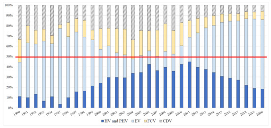 Furthermore, besides HVs and CDVs, advanced countries (such as Japan, the EU, and the US) were also making efforts in developing FCVs [19,20]. Consequently, the number of research on FCVs and CDVs continued to increase, occupying half of the number of research studies on NGVs in 2004 and maintaining such a level until 2009.