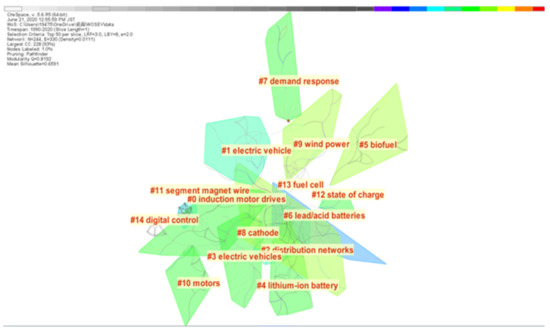 As shown in Figure 7, the 13 most mentioned topics were “induction motor drives”; “distribution networks”; “lithium-ion battery”; “biofuel”; “lead/acid batteries”; “demand response”; “cathode”; “wind power”; “motors”; “segment magnet wire”; “state of charge”; “fuel cell”; and “digital control”. Although “electric vehicle” is also listed as a topic in Figure 7, since we are analyzing EV articles already, “electric vehicle” should be excluded as an interference.