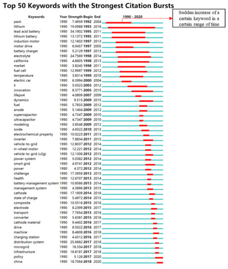 We found fifty keywords with the most robust citation bursts for research on EVs. In accordance with these keywords, we can conclude that the driving battery and motor have been the enduring research hotspots for EVs. Additionally, improving the performance and the durability of these components has also been a current research hotspot. This could because these components can decide an EVs’ performance. Moreover, with the popularization of EVs worldwide, research on EV charging facilities has also become a hotspot.