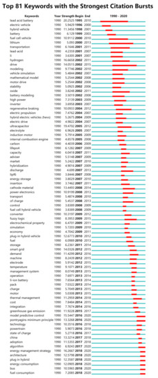 Furthermore, 81 bursts of keywords were detected from the research related to HVs. Similarly, battery technology and drive systems are sustained research hotspots for HVs. Additionally, “plug-in hybrid” has been a recent research hotspot. This may suggest that traditional HVs’ environmental performance and fuel economy are becoming less satisfying and so researchers/governments are taking a more aggressive strategy to solve the problem by installing PHVs, if not EVs.